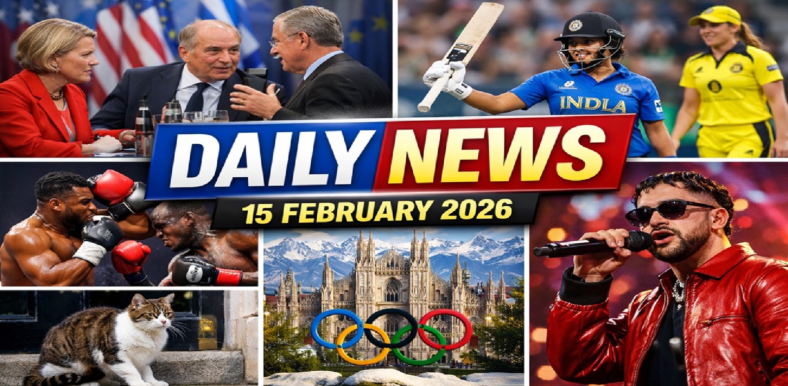 A comprehensive daily international news roundup for 15 Feb 2026 covering geopolitics, business, sports, entertainment, travel, and global affairs.