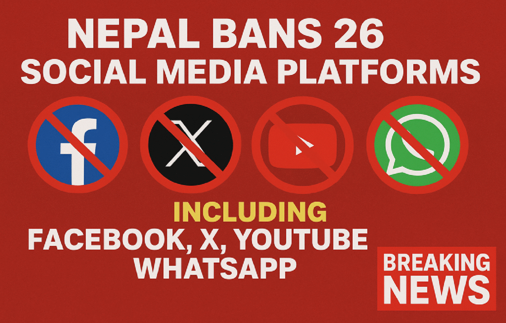 Kathmandu (Agency): In a major crackdown, the Government of Nepal has banned 26 social media platforms, including Facebook, X (formerly Twitter), YouTube, Instagram, and WhatsApp. The Ministry of Communications and Information Technology announced that the ban will be enforced nationwide after these platforms failed to comply with the mandatory registration order issued by the Nepal Telecommunication Authority.